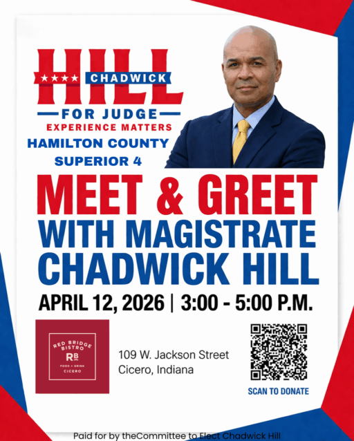 You are invited to a Meet & Greet with Chadwick Hill, candidate for Judge Superior Court 4. The event will be held April 12 from 3:00-5:00pm at Red Bridge Bistro, 109 W. Jackson St, Cicero.