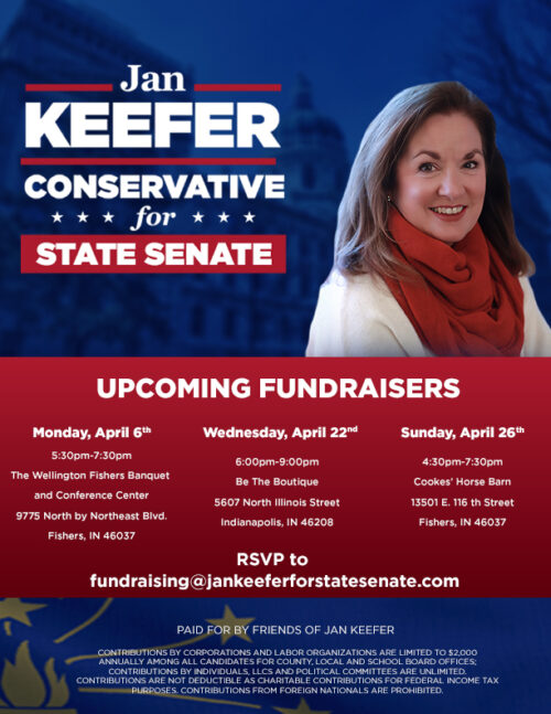 You are invited to attend a fundraiser in support of Jan Keefer for State Senate, District 31. The event will be held Wednesday, April 22 from 6:00-9:00 p.m. at Be the Boutique, 5607 North Illinois Street, Indianapolis, IN 46208.