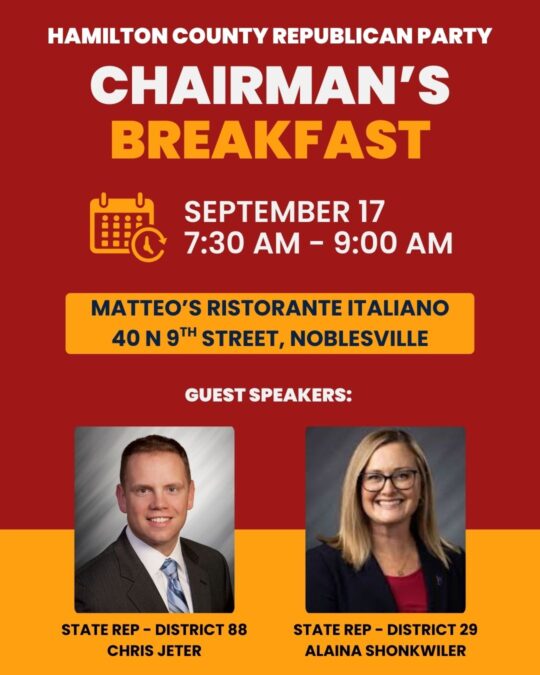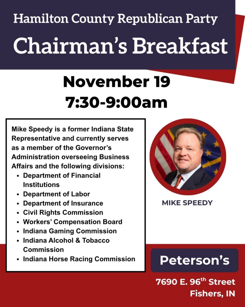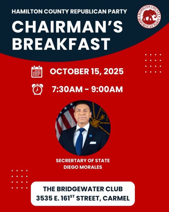 Join the Hamilton County Republican Party for Chairman's Breakfast on February 18 from 7:30-9:00 AM at The Bridgewater Club in Westfield. Our guest speaker will be Tony Katz of WIBC. Cost is $40, or free for Chairman's Club members. Register …